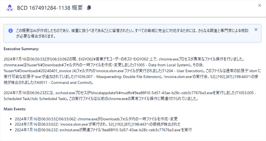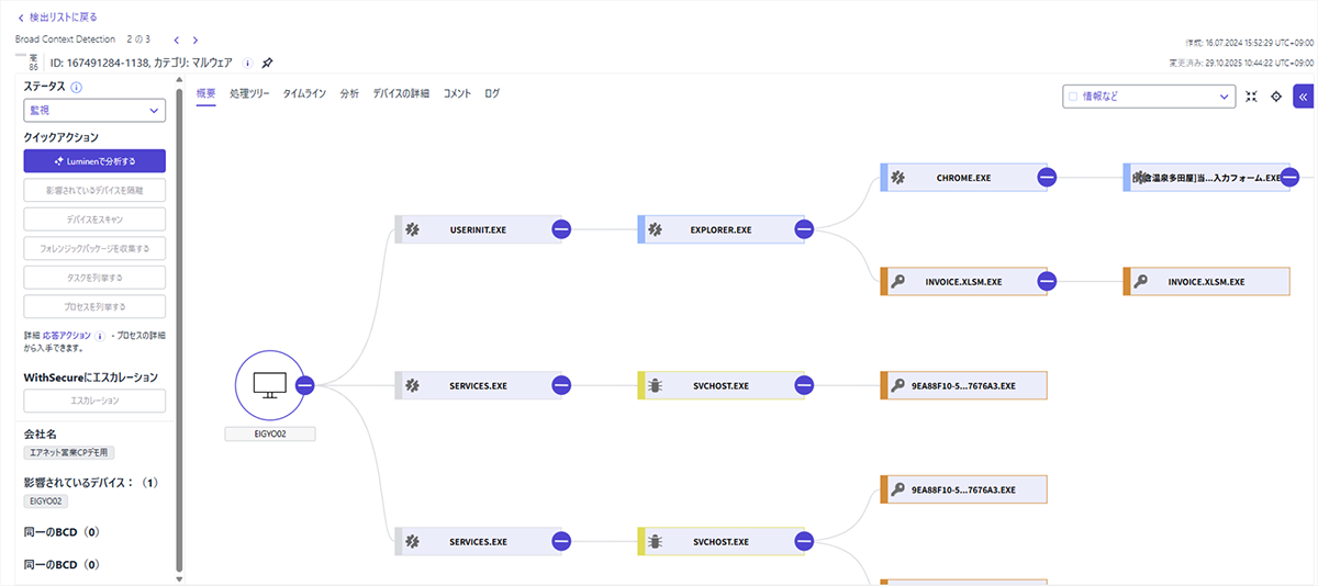| 異常なファイルアクセス | プロセスは異常なファイルにアクセスしています。たとえば、特権なしで複数の種類のドキュメントやシステムファイルにアクセスしたり、同様のことを行ったりしています。 |